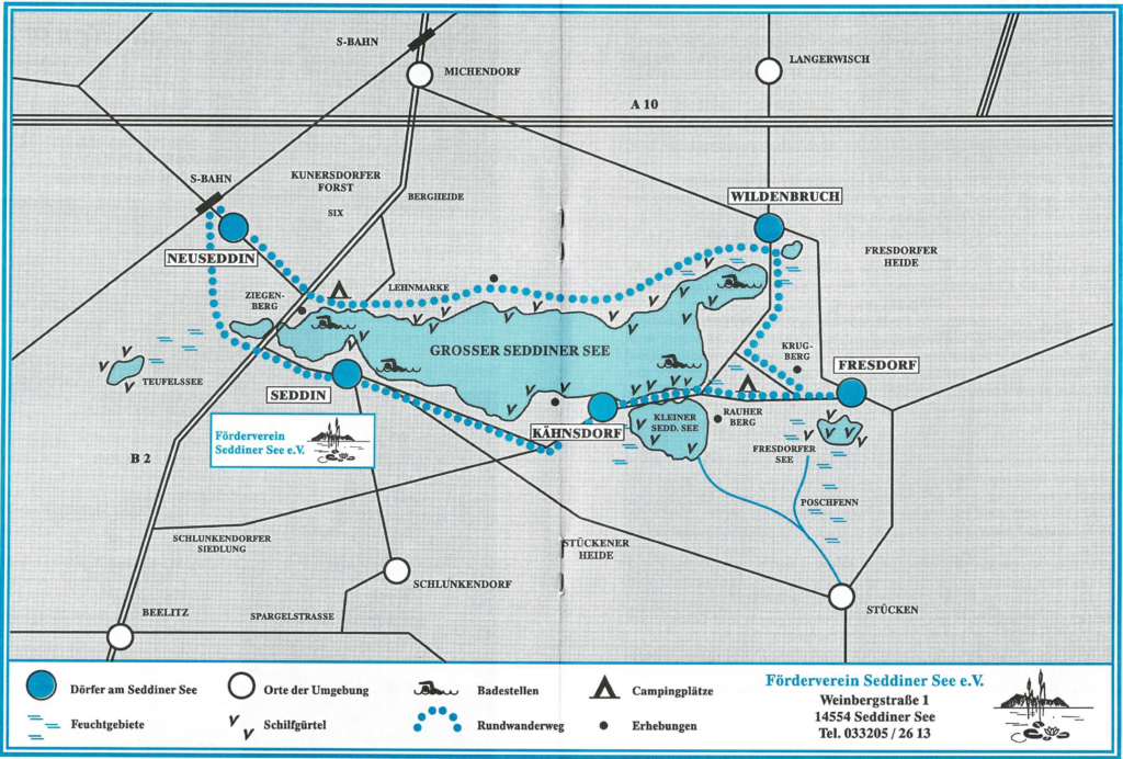 Der Besucher, der aus Potsdam oder von der A 10 – Abfahrt Michendorf (Potsdam-Süd) kommend den Seddiner See erreicht, trifft als erstes auf das Dorf Seddin am südwestlichen Ufer des Großen Seddiner Sees. Seddin hat rund 850 Einwohner und gehört seit Dezember 1993 zur Gemeinde „Seddiner See“.